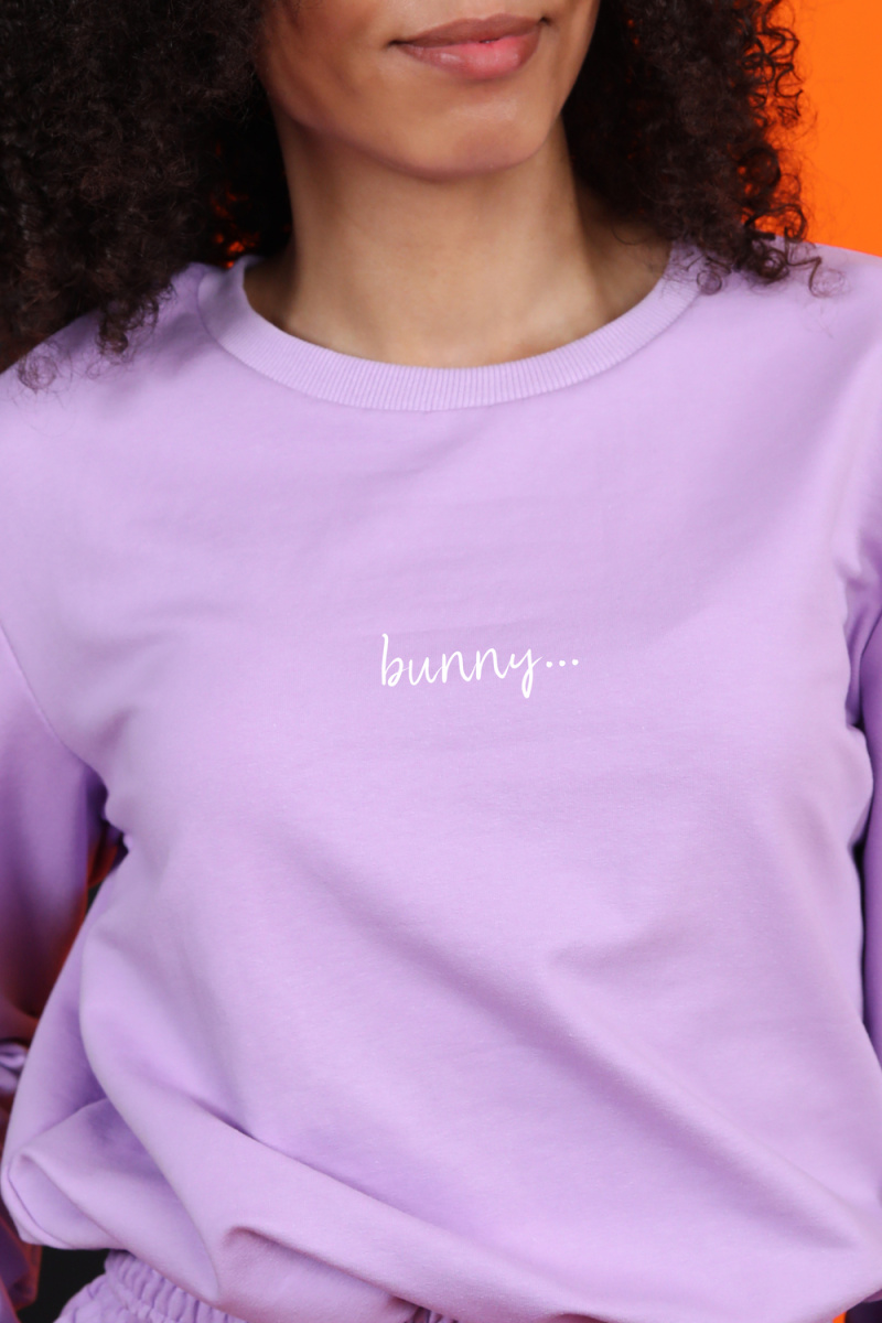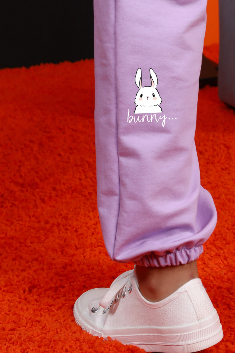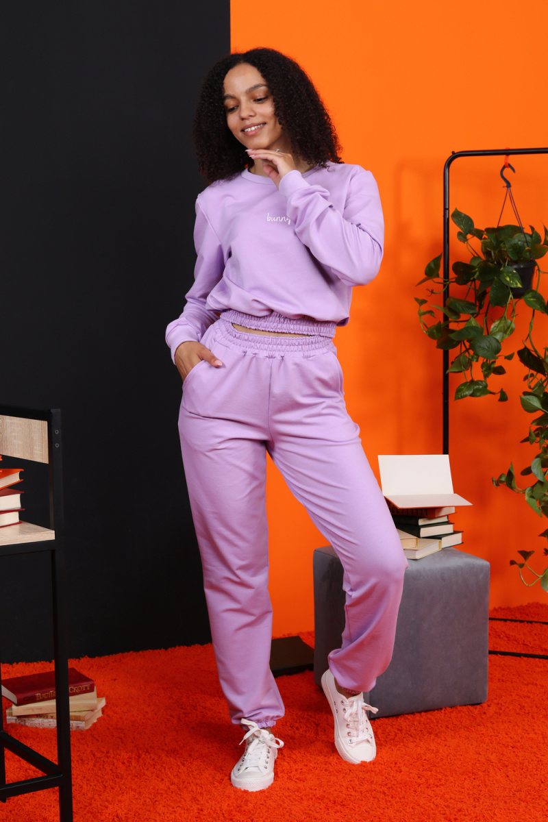 Костюм женский для повседневной носки. Данная модель выполнена из трикотажного полотна футер 2-х нитка. Толстовка с втачным рукавом. На полочке присутствует маленьким принт. Манжеты на рукавах и горловина выполнены из эластичного трикотажного полотна кашкорсе. Пояс на толстовке и брюках выполнены из основной ткани под поясную машинку (отделочная тройная строчка). Брюки имеют по бокам карманы, принт на задней детали. По низу брюк вшита резинка 2,5 см.