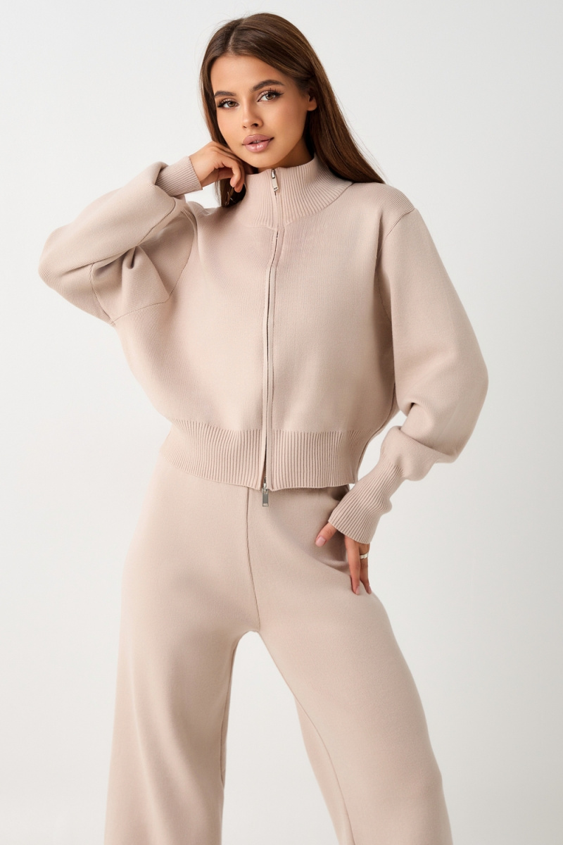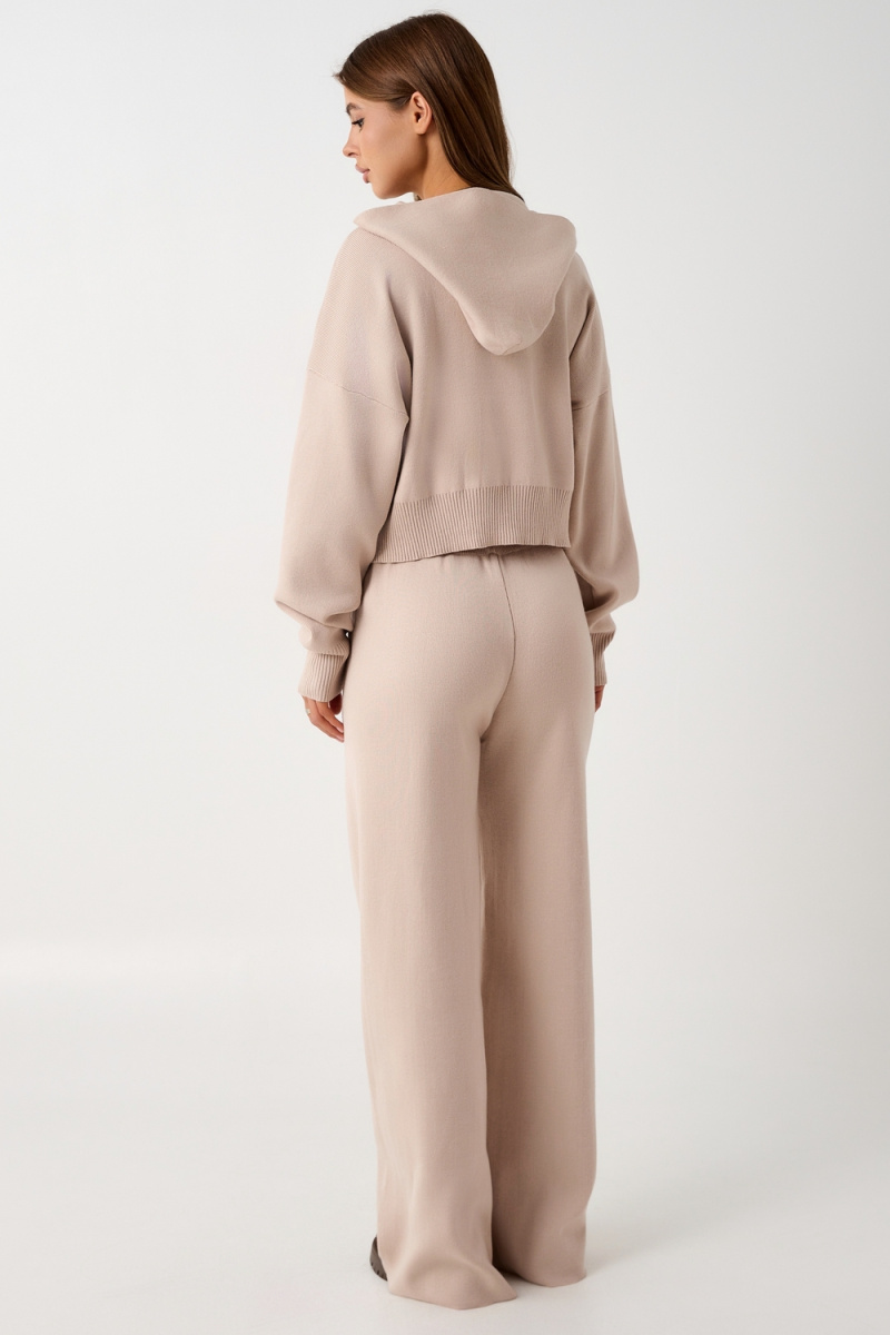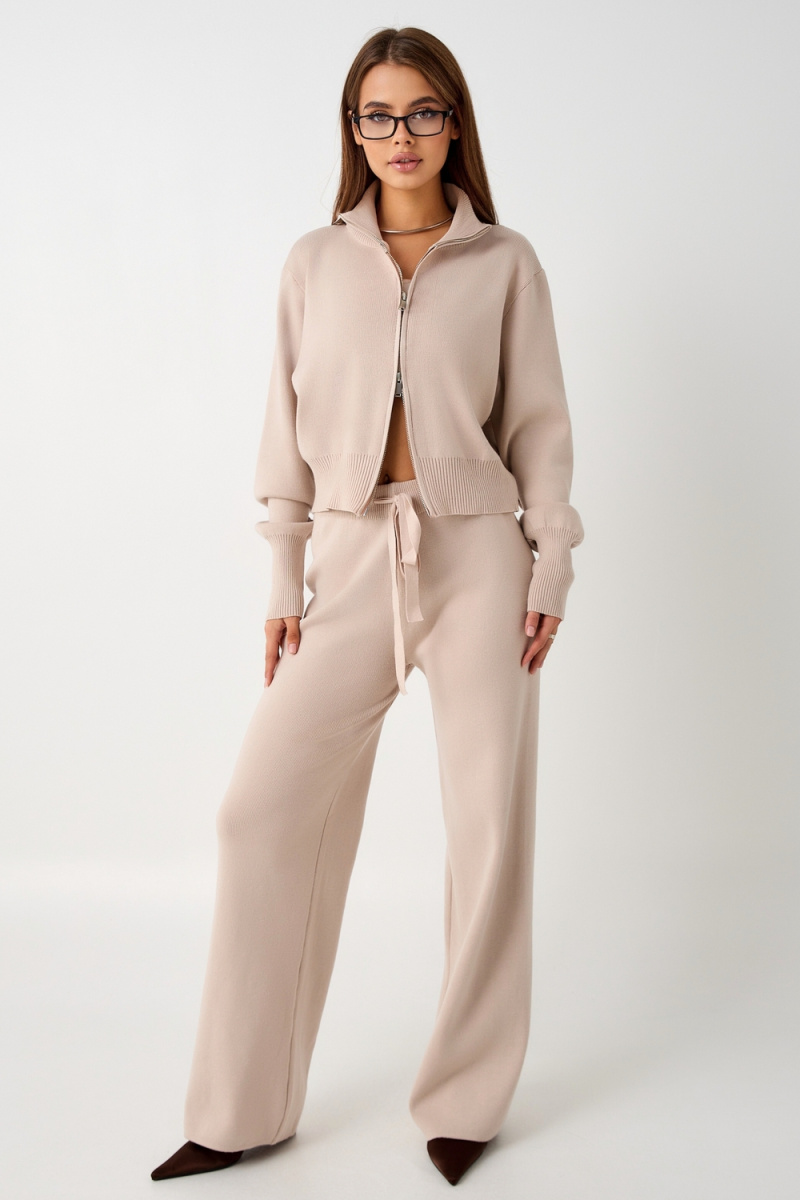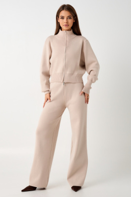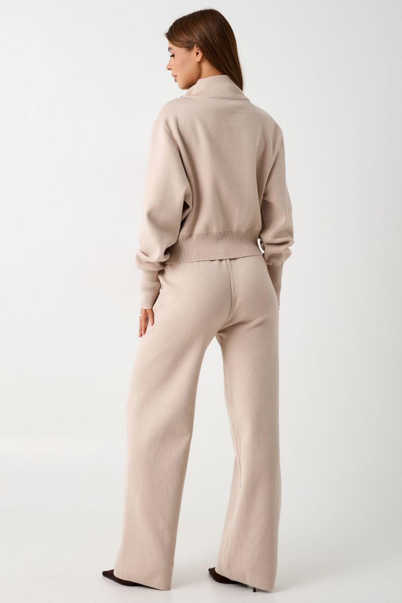 Вязаный костюм станет незаменимой основой женского гардероба для прохладной погоды, комфортным способом утепления. Он сшит из мягкой, приятной к телу пряжи с шерстяными волокнами, которая надолго сохраняет насыщенность цвета и свою форму, выдерживая интенсивное ношение и частые стирки. Стильный дизайнерский комплект отличается продуманным дизайном: кофточка - оверсайз со спущенным плечом, V-образным вырезом горловины и отложным воротником обеспечивает комфорт, а брюки - спортивки с широким поясом - резинкой, длинными штанинами с манжетами и удобными карманами подчеркивают силуэт, не сковывая движений. Универсальность классической пастельной палитры и лаконичного дизайна позволяет легко включать комплект в коллекцию вещей для осенне - весеннего демисезонного и зимнего периода. Он идеально сочетается с однотонными вариантами обуви и нарядными праздничными аксессуарами для создания элегантного и собранного образа.