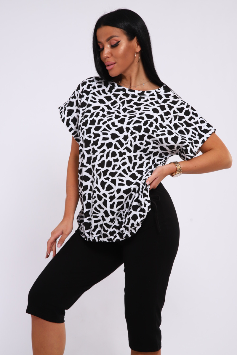 Костюм футболка и бриджи. Футболка свободного кроя, плечо спущенное с манжетом, низ на завязках. Бриджи на резинке