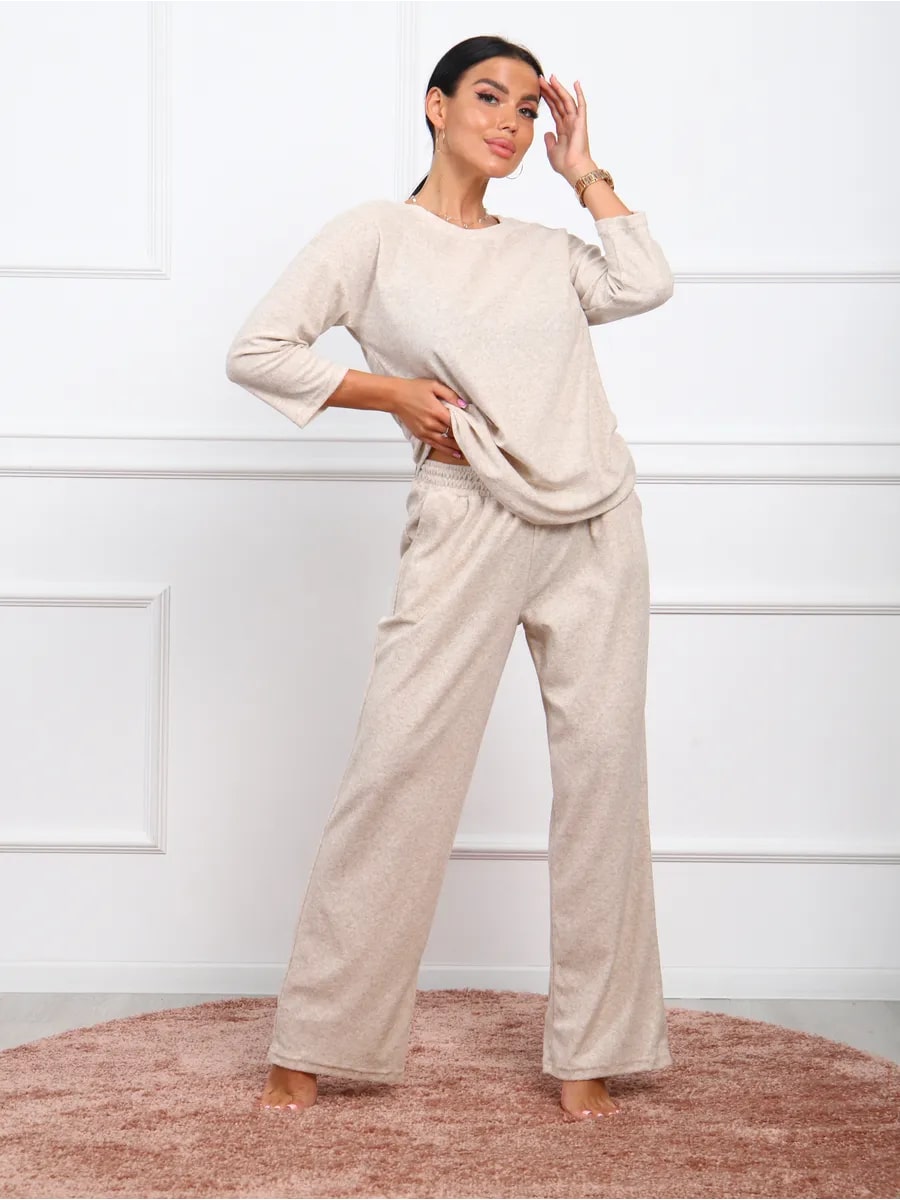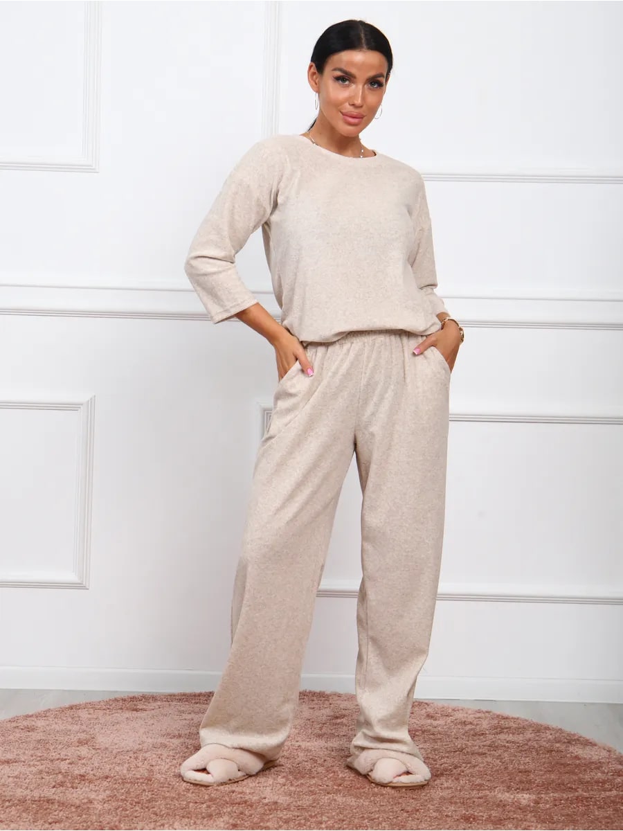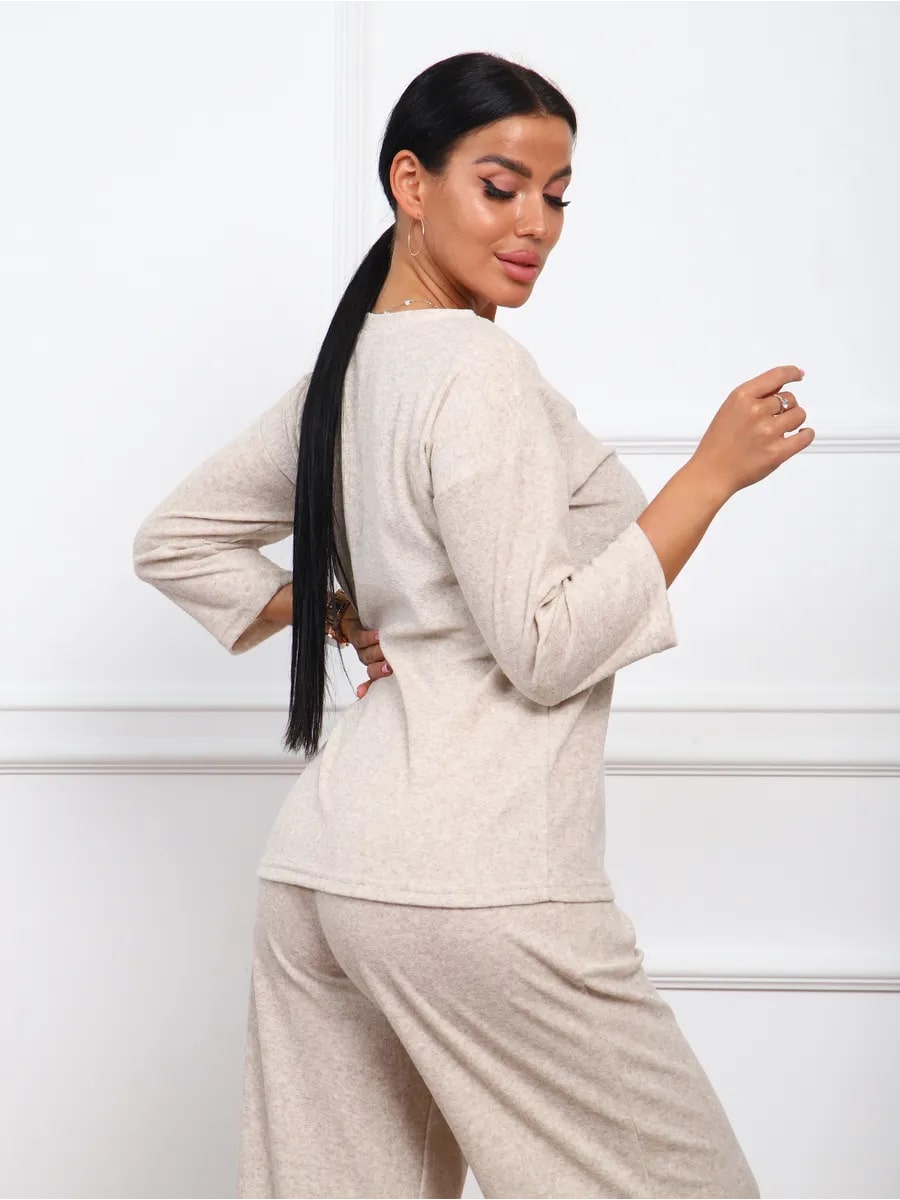 Женский костюм, который идеально подойдет для теплых весенних и летних дней. Обладает теплотой, что делает его подходящим вариантом в период весны и лета. Комплект с рукавом 3/4, отлично подойдет для домашних посиделок. Одежда базовая и однотонная, что позволяет легко комбинировать с другими элементами гардероба. Махровый материал создает невероятно мягкое ощущение, обеспечивая комфорт в течение всего дня. Этот теплый трикотаж отлично удерживает тепло, поэтому вы всегда будете чувствовать себя уютно даже в самые холодные дни. Брючный вариант расширенного кроя оверсайз обеспечивает свободу движений и подходит для женщин больших размеров. Этот модный комплект выполнен из махры великолепного качества, что делает его незаменимой частью любого гардероба и для посиделок дома. Он разработан специально для тех женщин и девушек, которые предпочитают стиль. Мягкий текстиль не только приятно носить на теле, но он также прост в уходе. Домашняя одежда поддерживает молодежный стиль благодаря современному дизайну и продуман